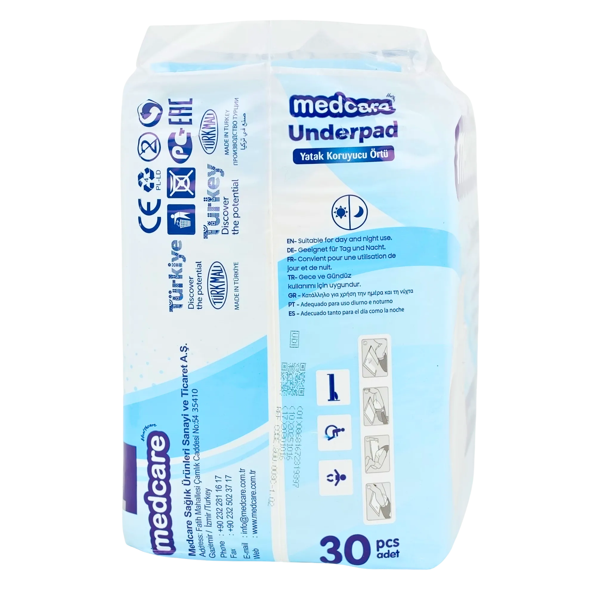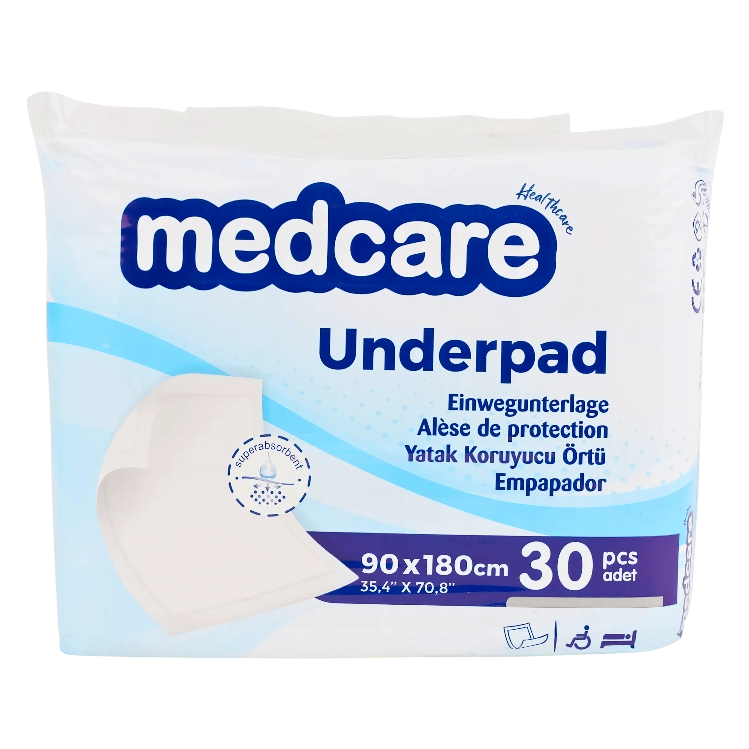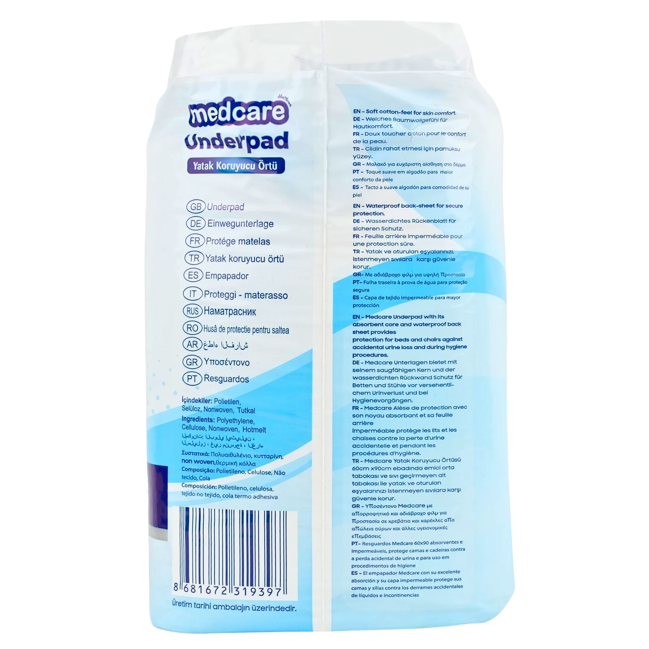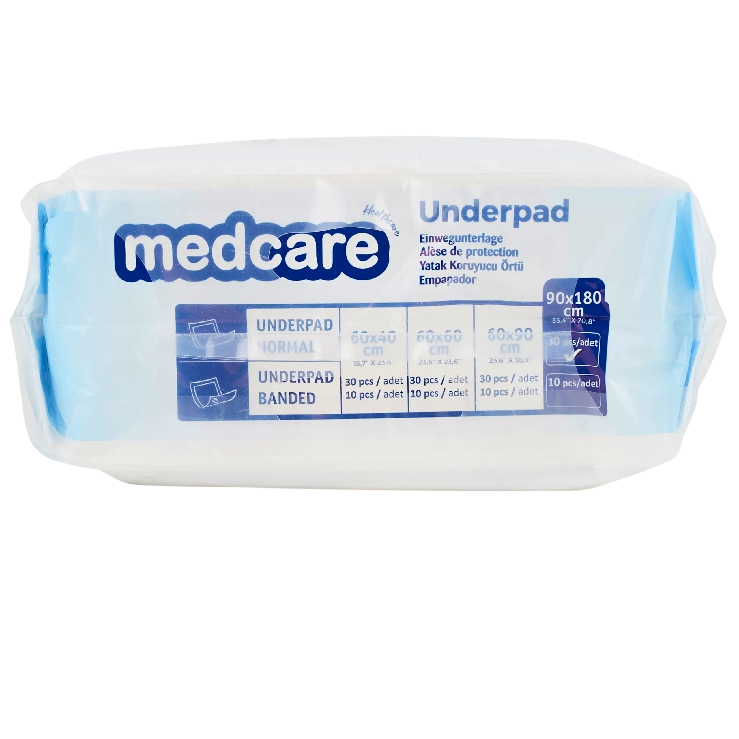 90×180 cm boyutlarındaki emici üst katmanı ve sıvı geçirmez alt katmanıyla Medcare Underpad, kullanıcıyı ve yatağı sızıntılara karşı güvenle korur. Emici katmanı ve su geçirmez dış yüzeyi sayesinde orta ila düşük oranda kazara sızıntılara karşı koruma sağlar. Hasta hijyenini sağlamak için iyi bir koruma alternatifidir. Medcare Underpad hassas ciltler için uygundur. Sızıntılara karşı etkili koruma sağlar. Standart tek kişilik yatağın tümünü kaplar.