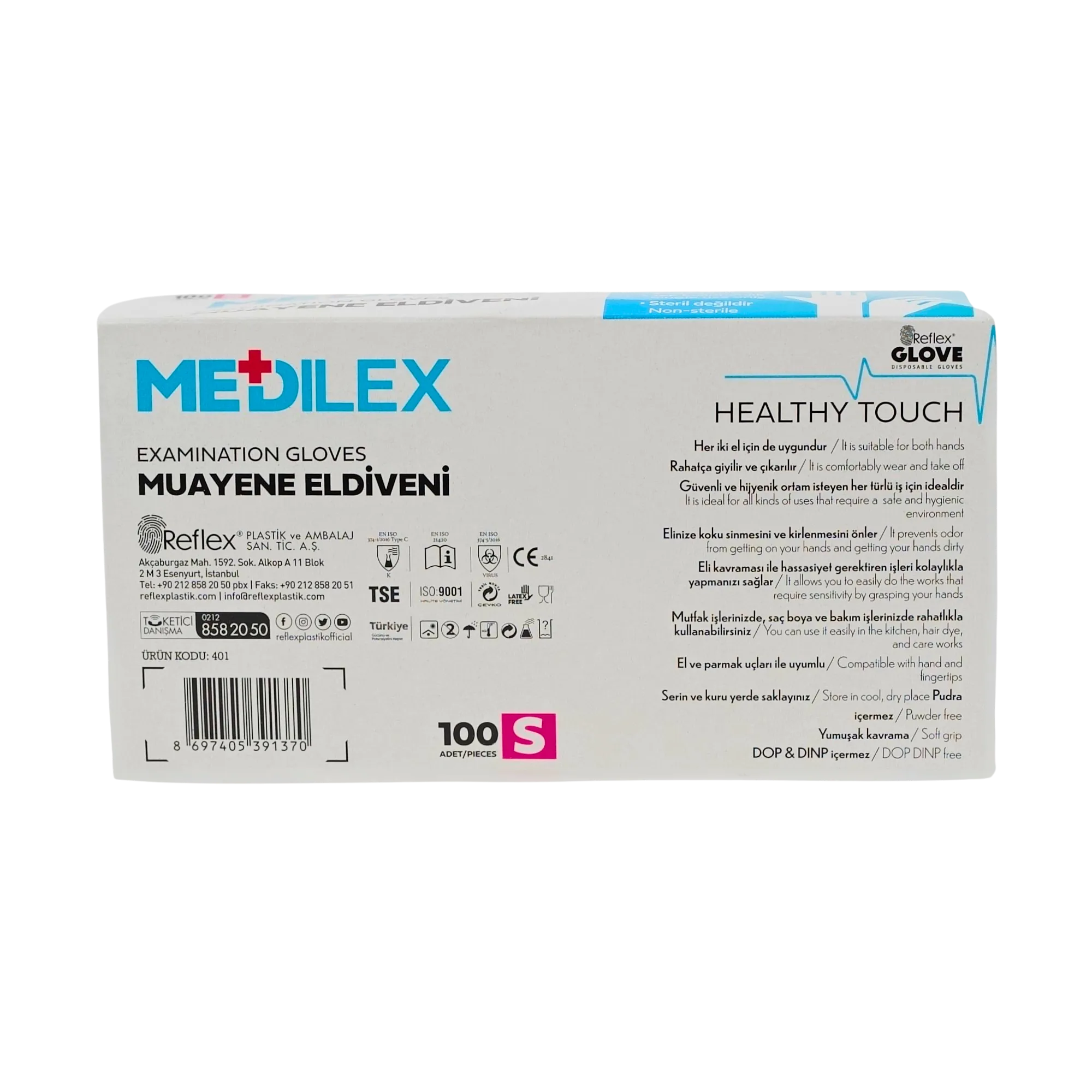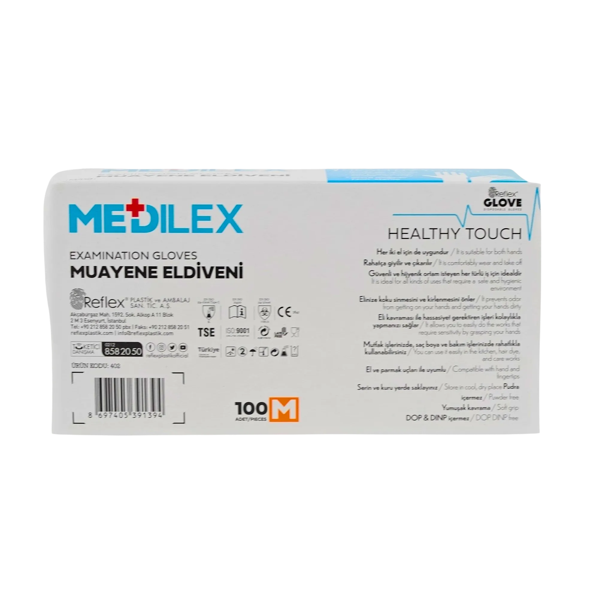Medikal standartlara uygun olarak üretilen REFLEX Medilex eldivenler, kullanıcıların el hareketlerini kısıtlamadan rahat çalışma imkânı sunar. İnce fakat dayanıklı yapısı sayesinde hassas işlemlerde dokunma hissini korurken aynı zamanda koruyucu bir bariyer oluşturur.
