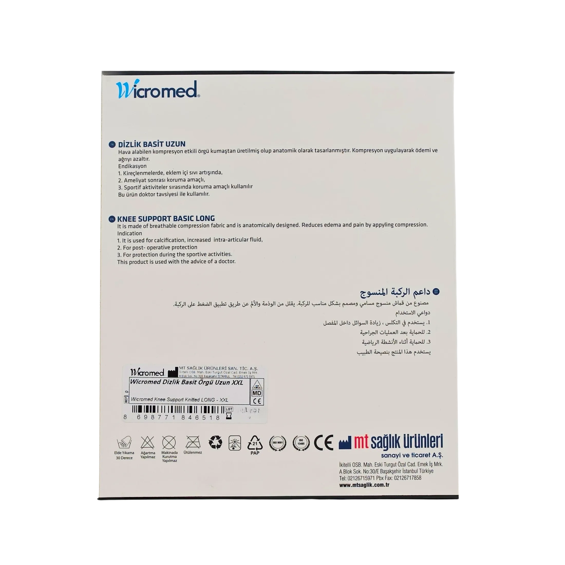 WICROMED Dizlik Basit Örgü Uzun (2XL), diz eklemini ve çevresindeki kas dokusunu destekleyerek günlük hareketler sırasında stabilite sağlamaya yardımcı olur. Uzun tasarımı sayesinde daha geniş bir destek alanı sunarak diz çevresindeki kasların desteklenmesine katkı sağlar.